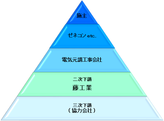主に電気工事元請会社より受注し、弊社社員が元請会社の管理スタッフの立場となって、協力会社に対し指示・管理監督を行います。