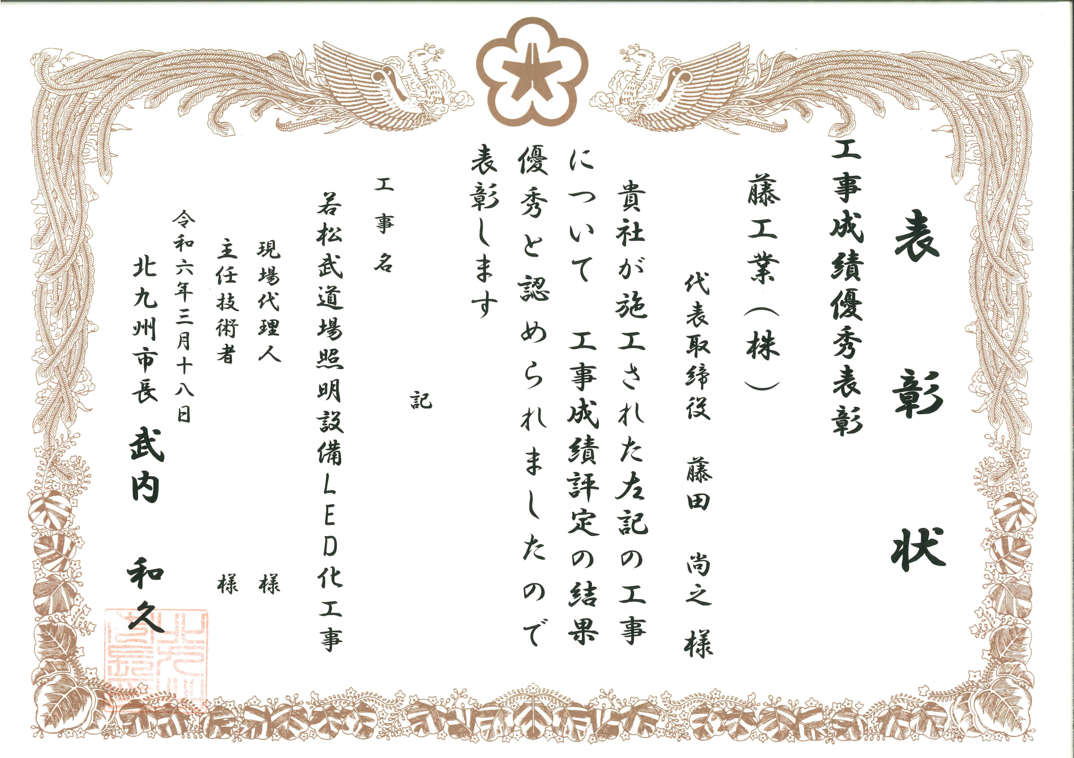 ※この度、当受注工事【若松武道場照明設備LED化工事】施工に従事した結果、北九州市より【工事成績優秀表彰】を受賞しました。