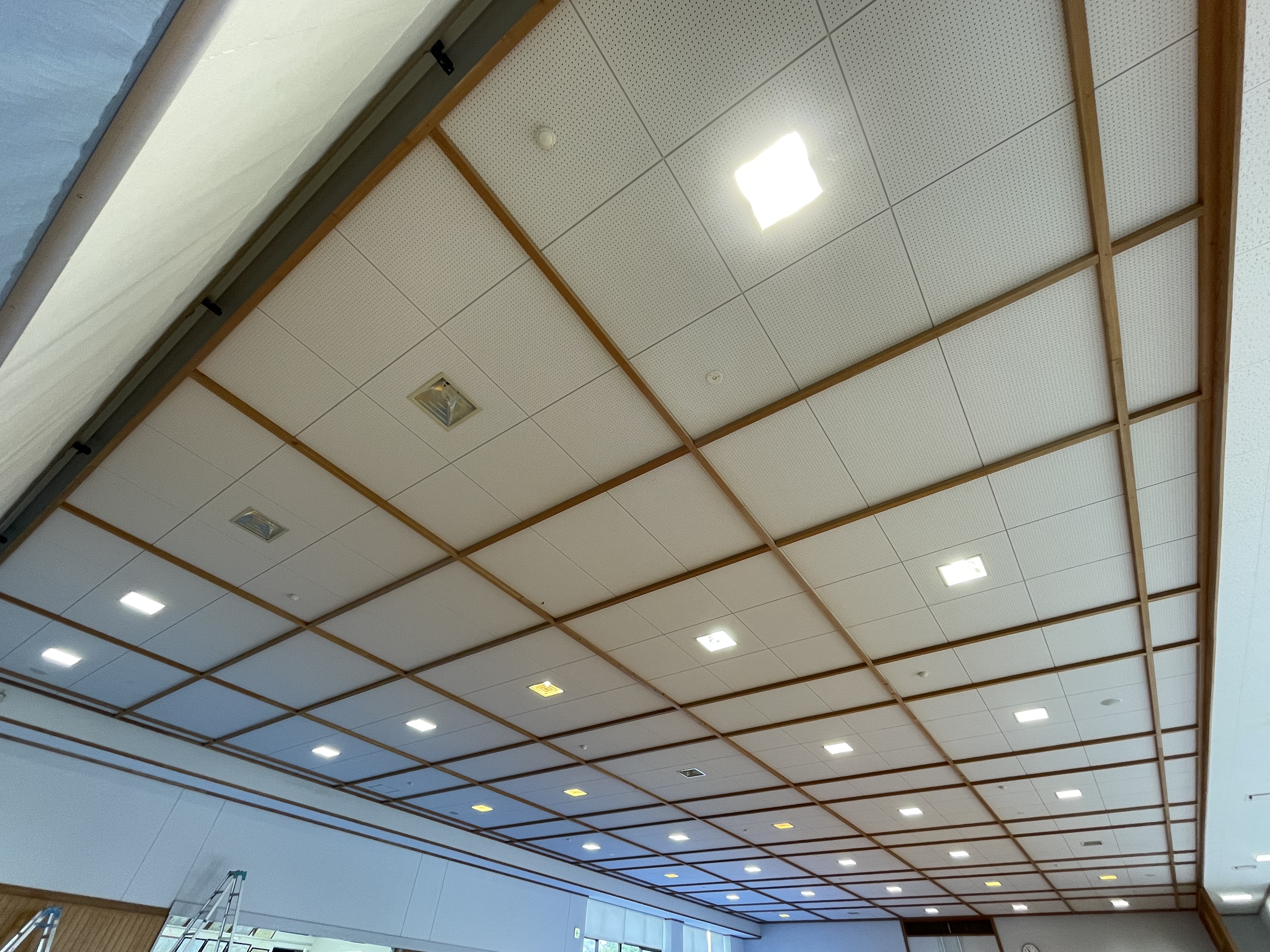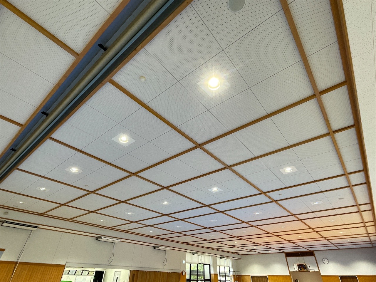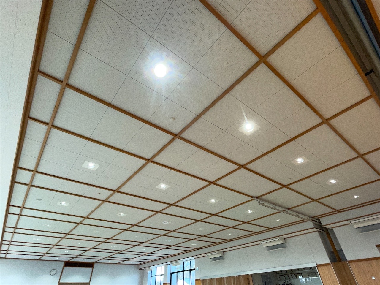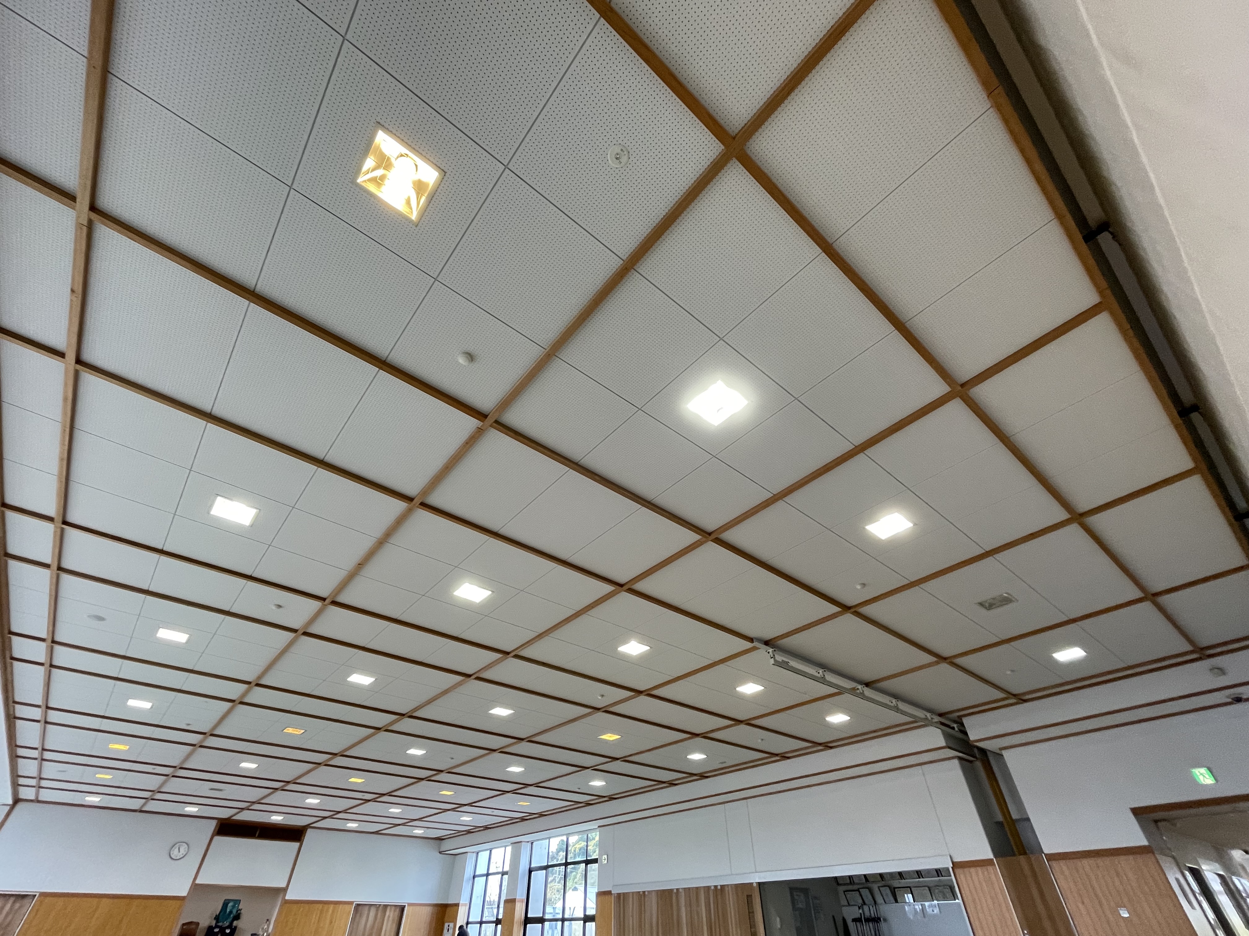 メインの柔道場・剣道場の照明器具は、既存の四角の埋込照明器具に対し、四角のリニューアルプレートを特注で製作して高照度のLEDダウンライトを設置するというところに大変苦労を要しましたが、関係者皆様のご協力の中、全ての工事を無事完工することが出来ました。